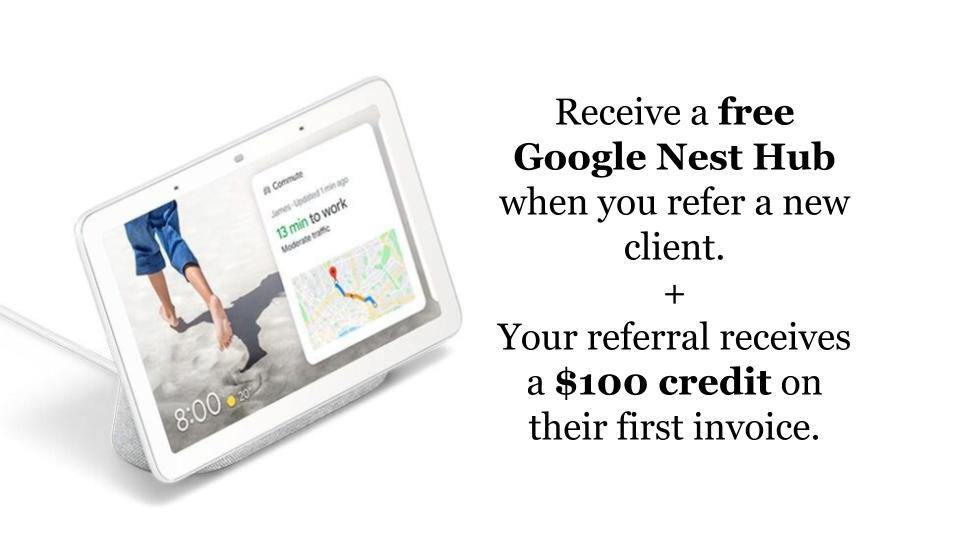 Receive a free Google Nest Hub when you refer a small business corporation or startup corporation for one of ReInvestWealth's accounting packages.
